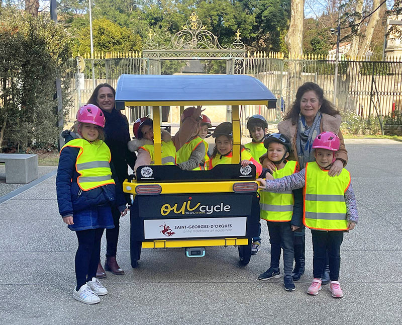 Les jeunes passagers sont parés pour l’aventure : ceinture de sécurité attachée, casque et gilet jaune enYlés. Le cartable contre le torse, « en mode airbag ».